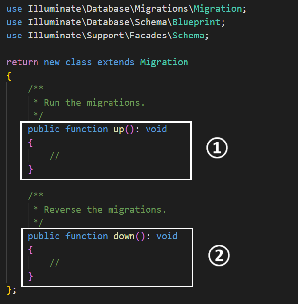 }こちらは、①upメソッド(テーブル作成)を取り消す(ロールバック)処理になるのでdropIfExistsメソッド(テーブルがあれば削除)を記述する。