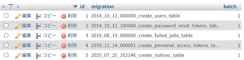 データベースを開くと「migrations」というテーブルがあるので、レコードを見てみます。