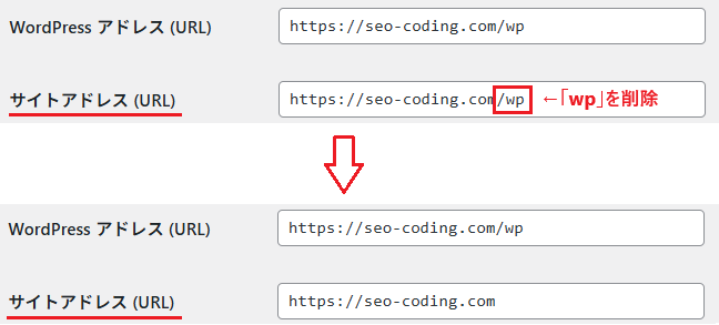管理画面>設定>一般 の「サイトアドレス (URL)」から「wp」を削除し、設定を保存します。